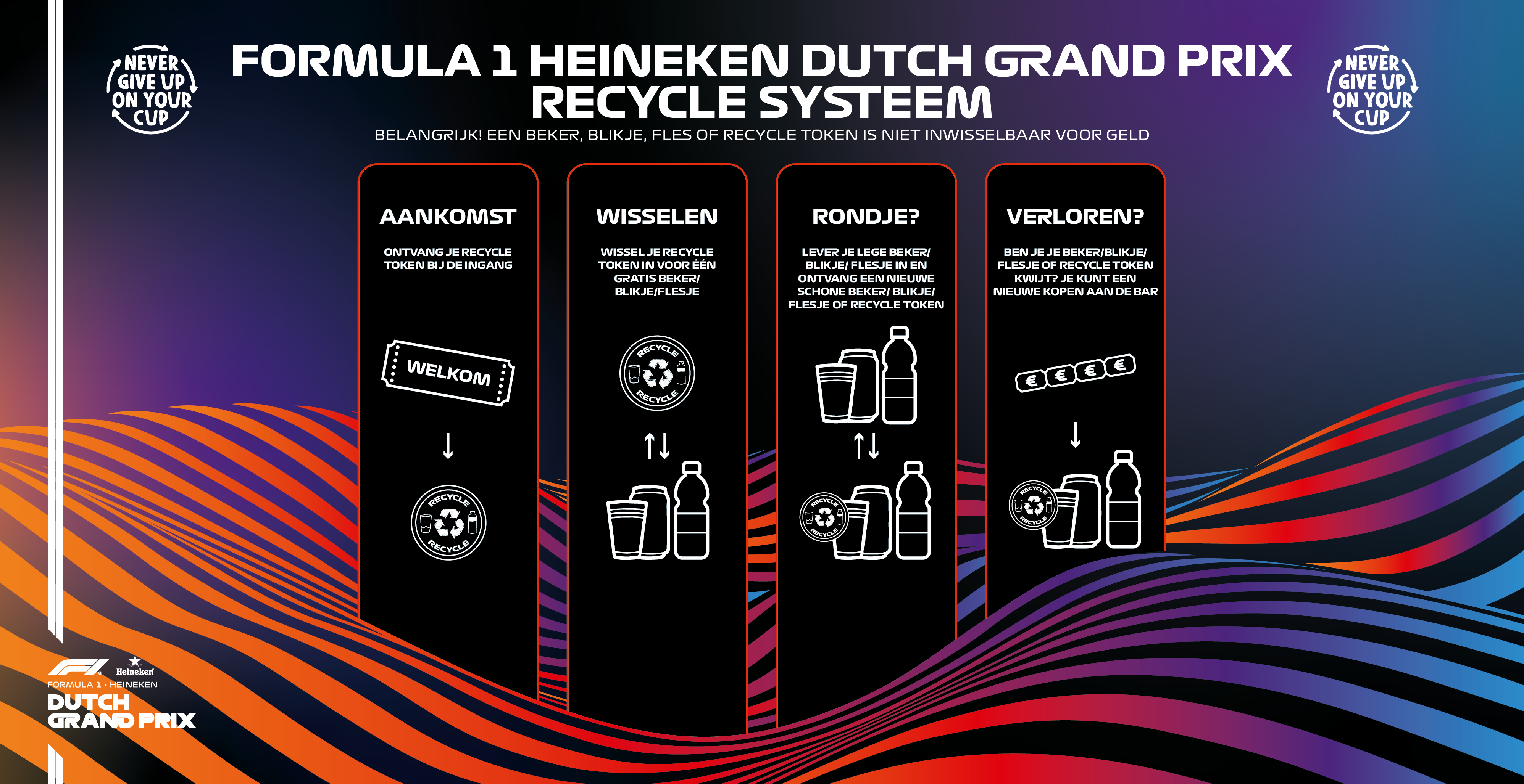 Om afval te verminderen en te recyclen, maken we tijdens het evenement gebruik van recycle tokens. Deze werken als een statiegeldsysteem voor bekers en blikjes. Zo zorgen we samen voor een schoon circuit.
